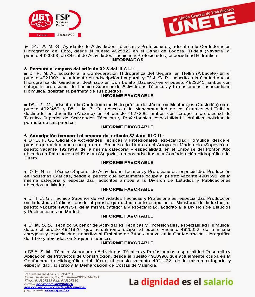 ♦ Da Ma J. R. D., Técnico Superior de Actividades Técnicas y Profesionales, especialidad Desarrollo y Aplicación de Proyectos de Construcción, desde su puesto 4921849 que ocupa en Sariñena (Huesca), al puesto 4921746, de su misma categoría y especialidad Hidráulica, en Monzón (Huesca), ambos adscritos a la Confederación Hidrográfica del Ebro. INFORME FAVORABLE