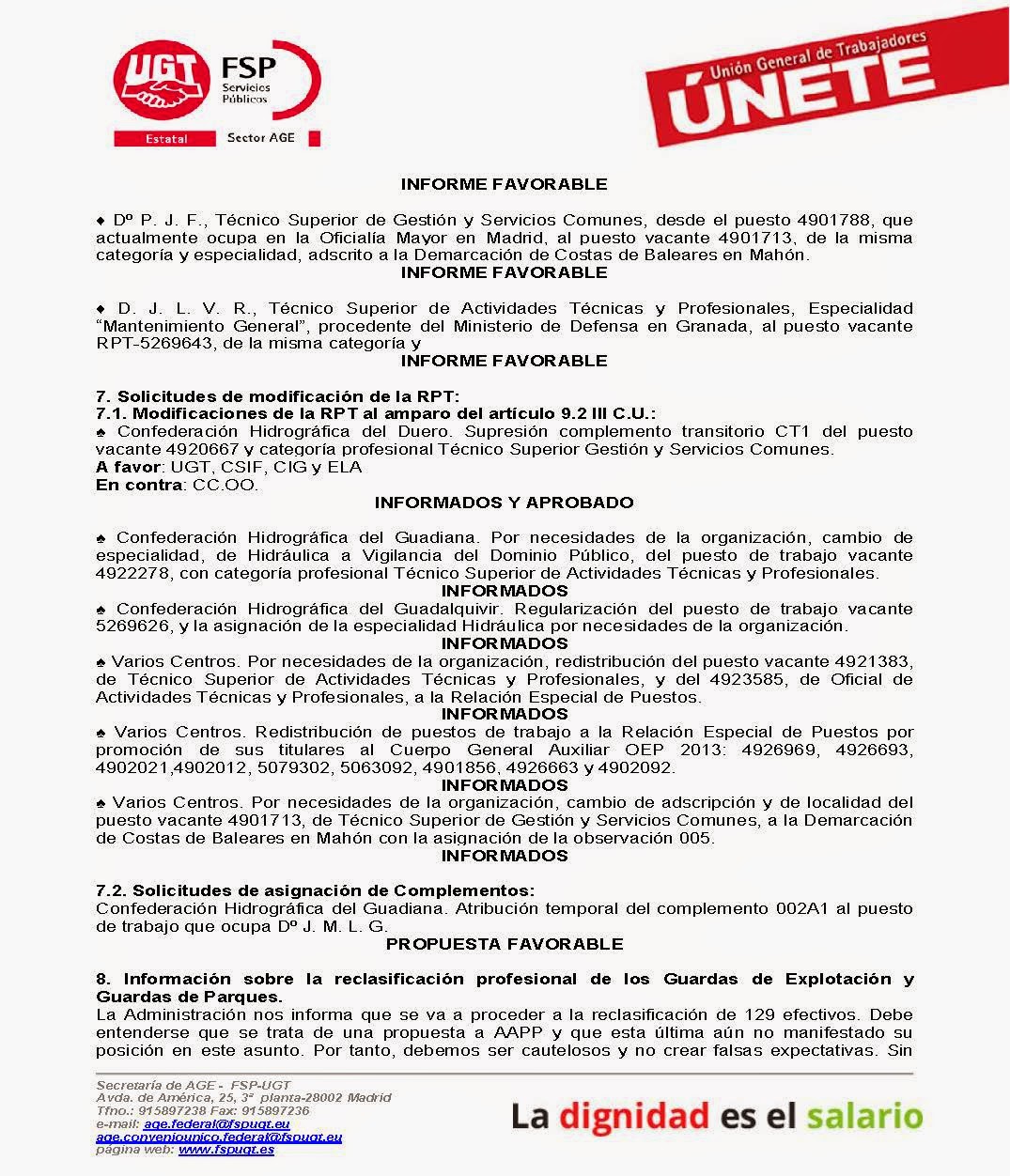 4.1. Modificaciones de la R.P.T. (artículo 9.2 III C.U.). ► Dirección General de Desarrollo Rural y Política Forestal. Creación de un puesto de trabajo por sentencia de categoría profesional de Titulado Medio de Actividades Técnicas y Profesionales, con titulación requerida de Ingeniero Técnico Forestal, en la Dirección General de Desarrollo Rural y Política Forestal a favor de Da M. P. G. F. INFORMADOS ► Confederación Hidrográfica del Guadiana. Por necesidades de la organización, cambio de localidad del puesto de trabajo vacante 4922263, con categoría profesional de Técnico Superior de Actividades Técnicas y Profesionales y especialidad Vigilancia de dominio público, a Belmonte (Cuenca). INFORMADOS